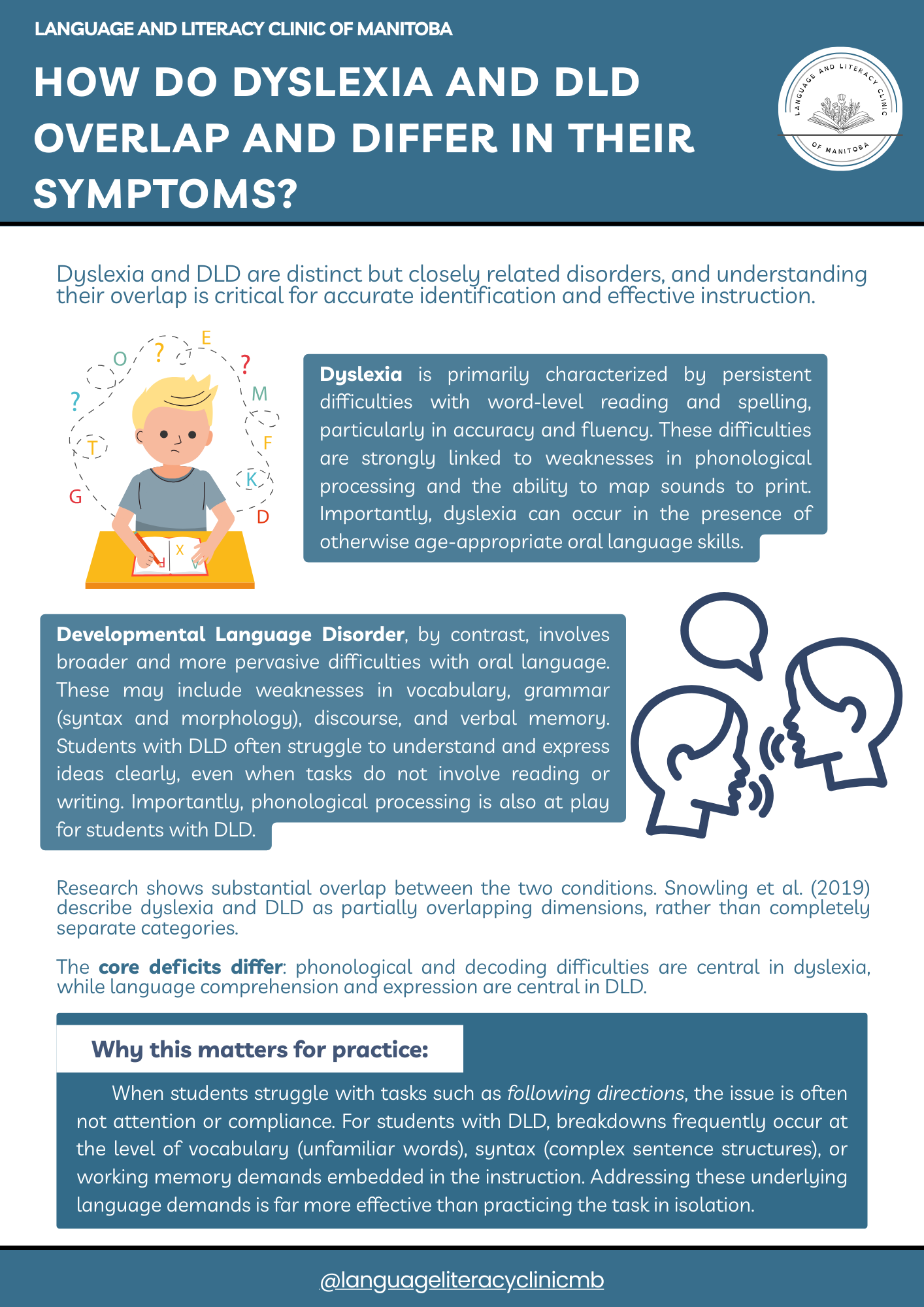 Snowling, M. J., Bishop, D. V. M., & Stothard, S. E. (2019). Dyslexia and developmental language disorder: Comorbid disorders with distinct effects on reading comprehension. Journal of Child Psychology and Psychiatry, 60(8), 841–850. https://doi.org/10.1111/jcpp.13029